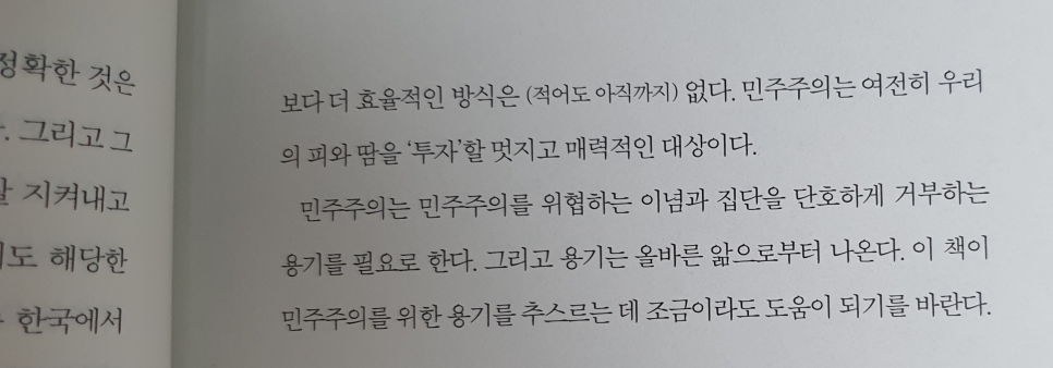 민주주의라는 열매는 우리나라의 역사를 보더라도 피로써 만들어낸 소중한 가치입니다. 저자는 왕정이나 과두정, 독재 같은 위험한 국가(권위주의)에 맞서 위대하대 꽃 핀 민주주의를 어떻게 잘 지켜낼 것인가 고민을 하게 하는 동시에 우리가 권위주의 시대를 관통하면서 겪은 지역주의, 진영논리 등을 어떻게 헤쳐나갈지 고민해 보게 하는 기회를 주고 있습니다.