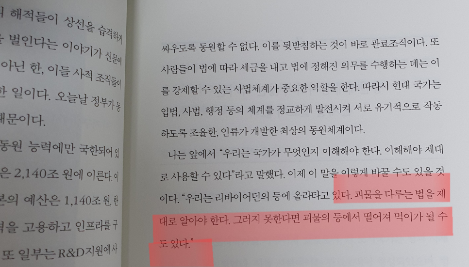 국가라고 하는 인류의 역사에 없어지지 않을 그 울타리를 민주주의는 국가가 괴물이 되지 않게 끝까지 싸워야 하는 존재입니다. 국가가 괴물이 되는 순간 민주나 자유 같은 그런 우리가 생각했던 이상적인 가치는 온 데 간 데 사라질 것입니다.