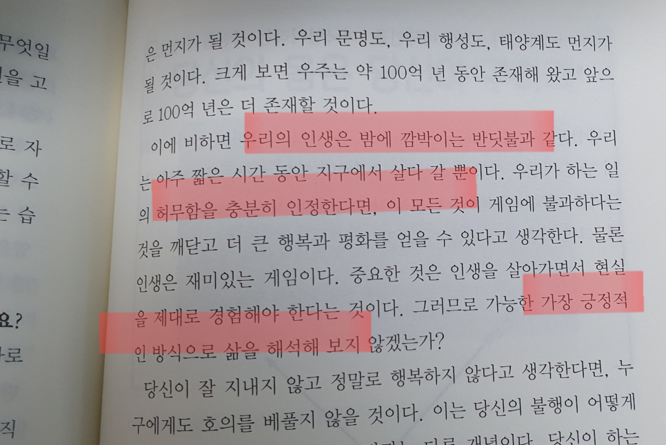 쉽게 생각해 보면 우리는 태어나면서 수억 마리의 다른 정자와의 경쟁에서 이겨냈습니다. 사실, 이걸로 우리는 이미 목적을 이루었고 존재의 가치를 증명했습니다. 또 반대편에서 보면 우주에서 우리의 존재는 정말이지 아무 의미도 없을지도 모릅니다.
