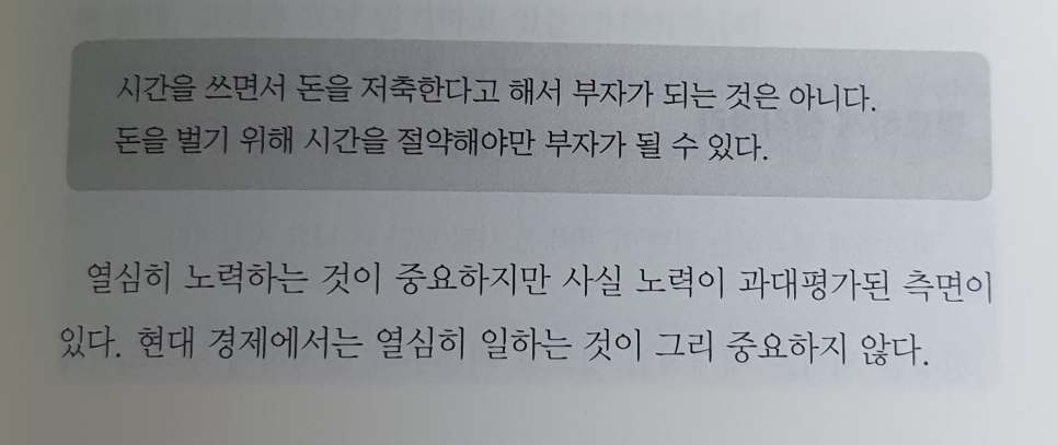 노동을 아무리 시간과 몸을 갈아 넣는다고 해도 결국에는 자본을 쓰는 사람들에게 이용당할 뿐입니다. 노동에만 의미를 부여한다면 우리들의 생산성과 자산은 늘어나지 않습니다. 지렛대를 사용하여 같은 힘으로 더 많은 산출물을 만들어 내는 순간 생산성과 자산은 늘어나게 됩니다. 자본주의의 기본적인 원리이지만 대부분의 사람들은 잘 모르거나 부정하고 있습니다.