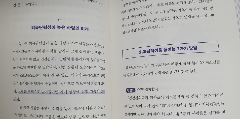 그래서 오히려 공부를 잘하는 사람들이 한 번의 실패로 영영 주저앉아 버리는 경우들이 많습니다. 한 번의 실패는 곧 끝이라는 사고방식이 머리에 박혀있기 때문입니다. 그래서 학교에서도 이제는 다양한 시도를 통해서 발전하는 법을 배우고 다양한 삶의 길을 알려주는 방향으로 교육이 진행되었으면 좋겠습니다.