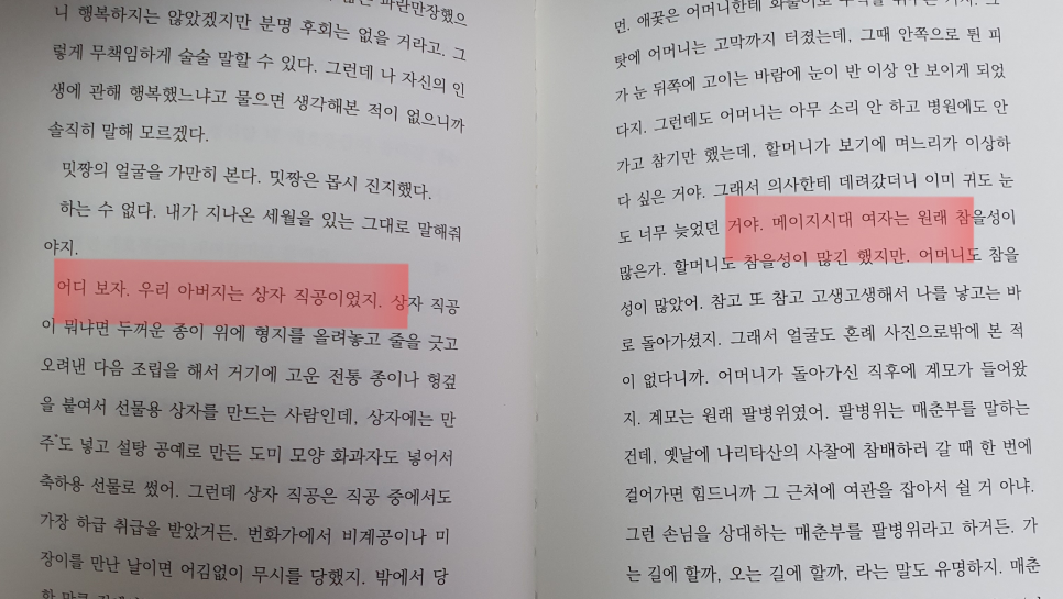 이 소설은 치매를 않고 있는 주인공이 과거의 삶을 회상하는 이야기입니다. 저자가 돌봄 일을 하면서 겪은 경험들을 토대로 하기에 더욱더 탄탄한 이야기가 되지 않았나 생각합니다. 실제로는 다양한 사람들의 이야기를 한 사람의 이야기로 뭉쳤으니 수많은 에피소드들의 집합체라고 할 수 있지 않을까 합니다.