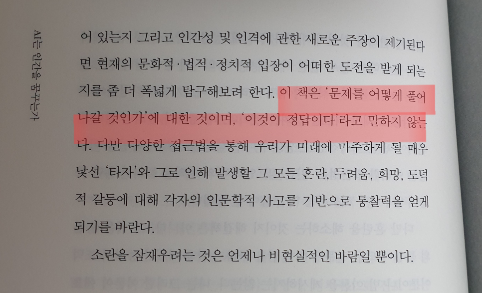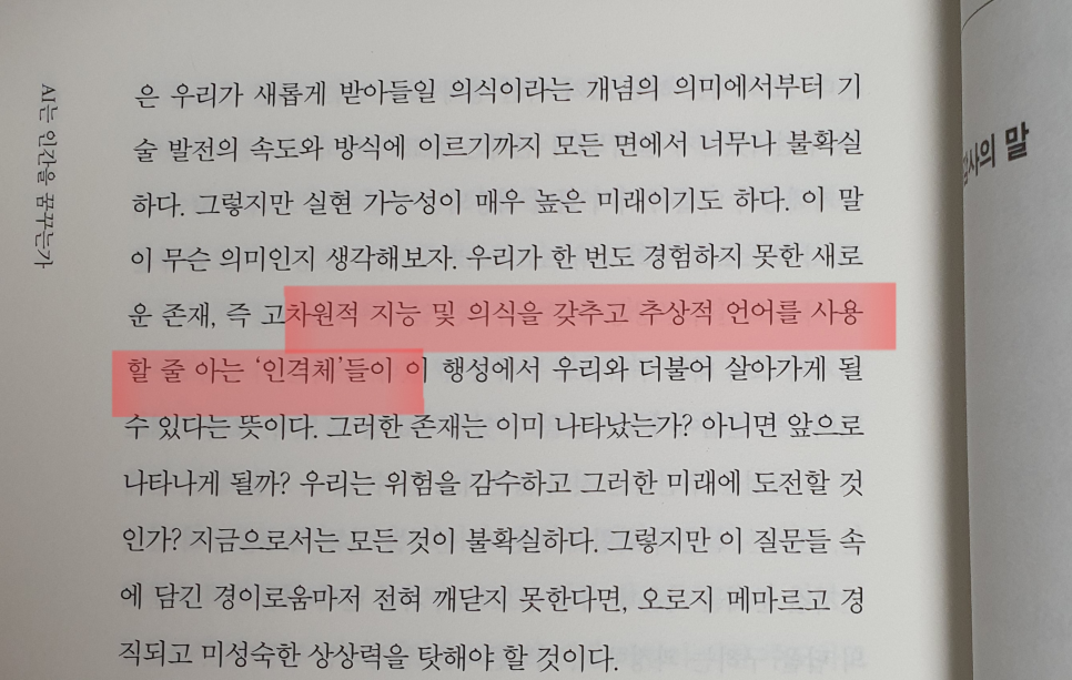 미래의 AI는 딱 뭐라고 정의할 것이 아니라 각자가 AI를 어떻게 바라볼 것인가를 계속 고민하는 것이 이 책의 목적이고 올바른 방향이라고 생각합니다.