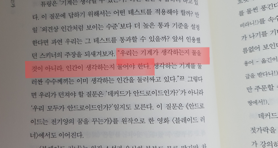 단순하게 AI의 발전을 기계 공업의 발전으로 바라보는 것이 안됩니다. 로봇이 생각하고 감정을 가진다는 것을 단순히 기술의 발전으로 치부한다면 그것은 과거 인류가 그래왔듯 생활을 편하게 하는 그 역할에 그치게 될 것입니다. 우리가 해야 할 생각은 그들을 앞으로는 같은 인간으로 받아들여야 하냐 마느냐로 포커스를 맞추어야 합니다. 인류가 아닌 것이 인류의 위치에 서게 된다는 것은 새로운 차원의 문명이 열린다는 것을 의미하기 때문입니다.
