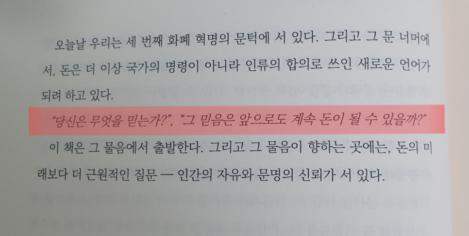 이 책을 통해 인류 문명의 배후에서 역사를 조종해온 '화폐'라는 거대한 에너지의 정체를 밝혀내는 과정에서 과거의 조개껍데기부터 미래의 비트코인까지 관통하는 부의 대이동을 한눈에 이해하면서 아는 만큼 보이고 막연한 두려움에서 벗어나는 계기가 될 수 있었으면 좋겠습니다.