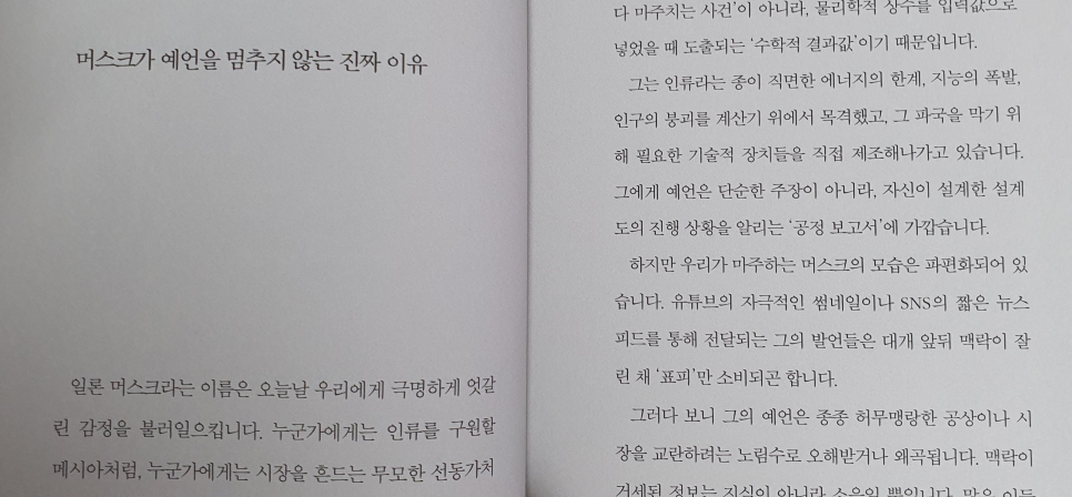 세상에는 미래를 예언하거나 예측하는 사람들은 셀 수 없을 만큼 많습니다. 하지만 일론 머스크의 예측이 다른 예언자들의 말보다 소름 돋고 무게감 있게 다가옵니다. 왜냐하면 그는 미래를 그저 상상만 하는 학자가 아니라, 막대한 자본과 실행력을 동원해 그 미래를 직접 만들어가고 있는 당사자이기 때문입니다.