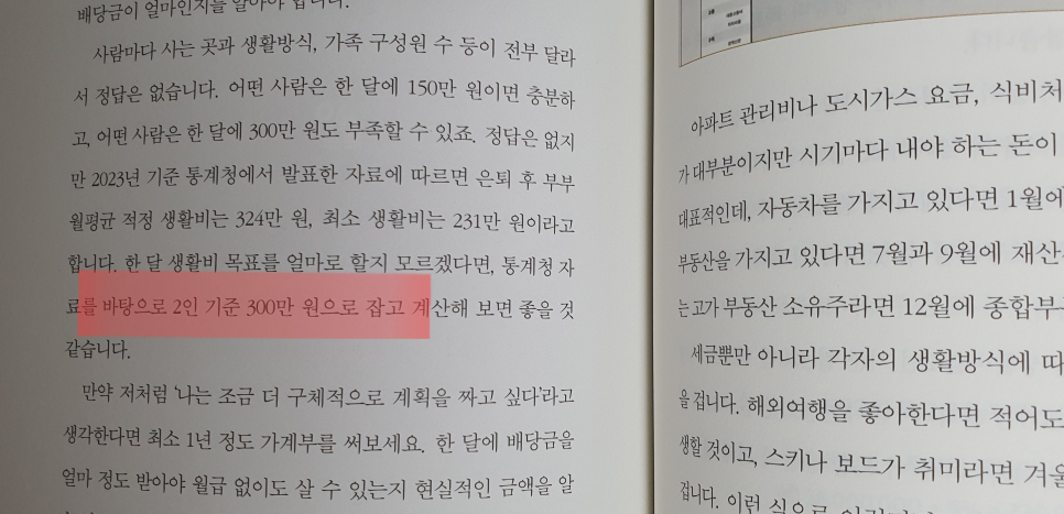 저자는 통계청 자료에 입각한 2인 300만 원에 조금 더 여유 있는 생활(여행, 취미)을 위해 월 400만 원의 목표를 잡았습니다. 아마 적정 생활비라고 하더라도 생각보다 모자란 부분이 많을 수 있다는 생각이 들기 때문입니다.